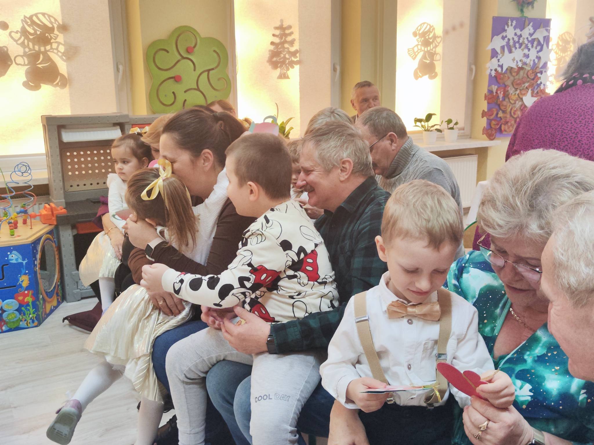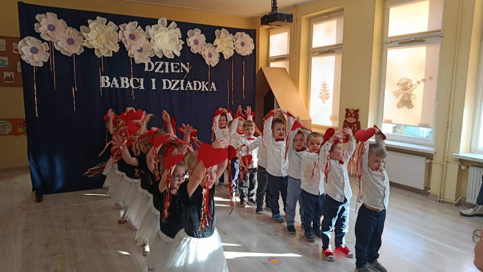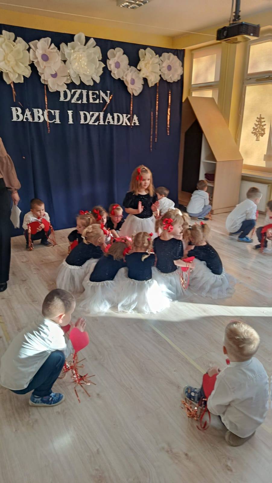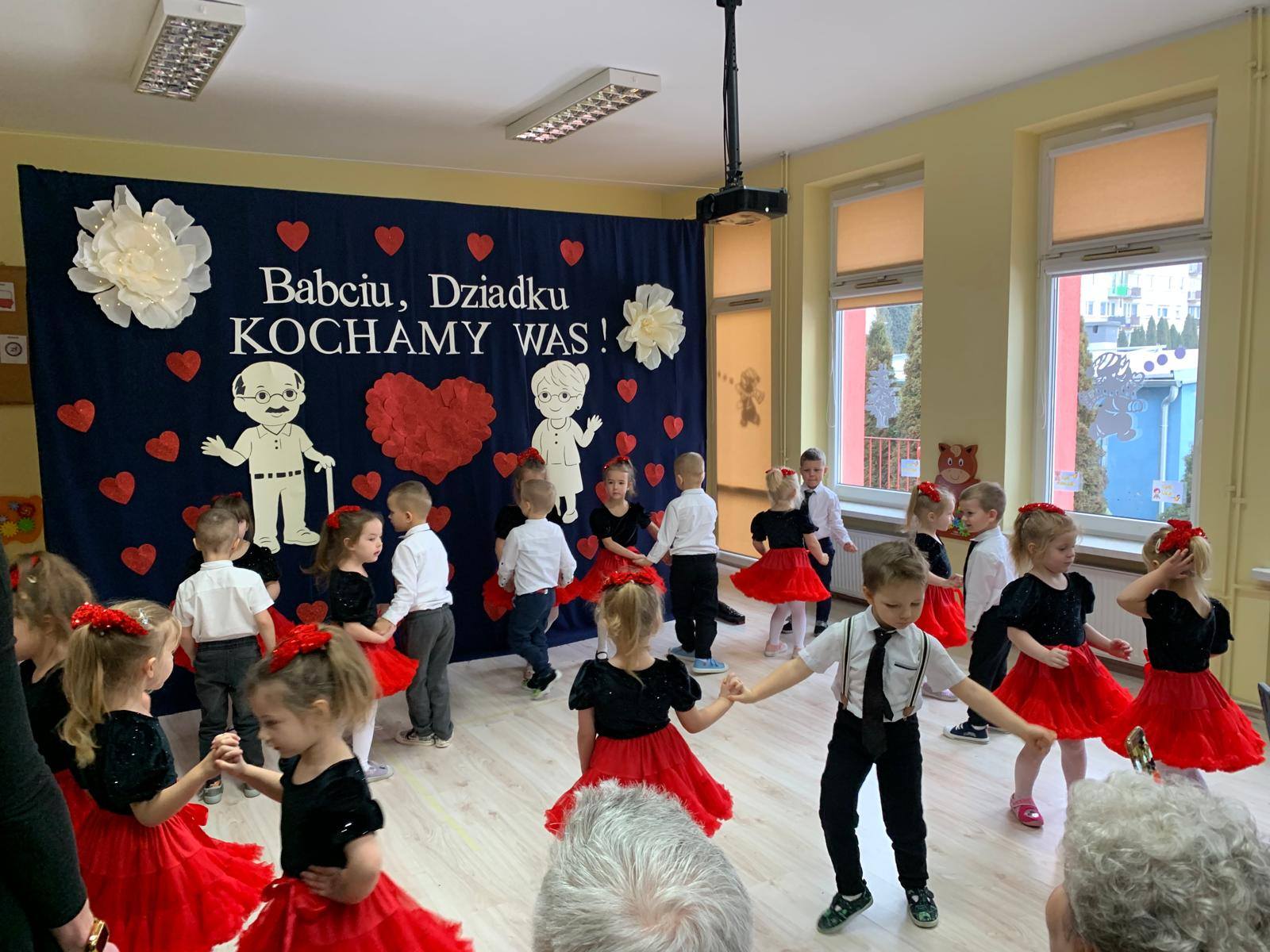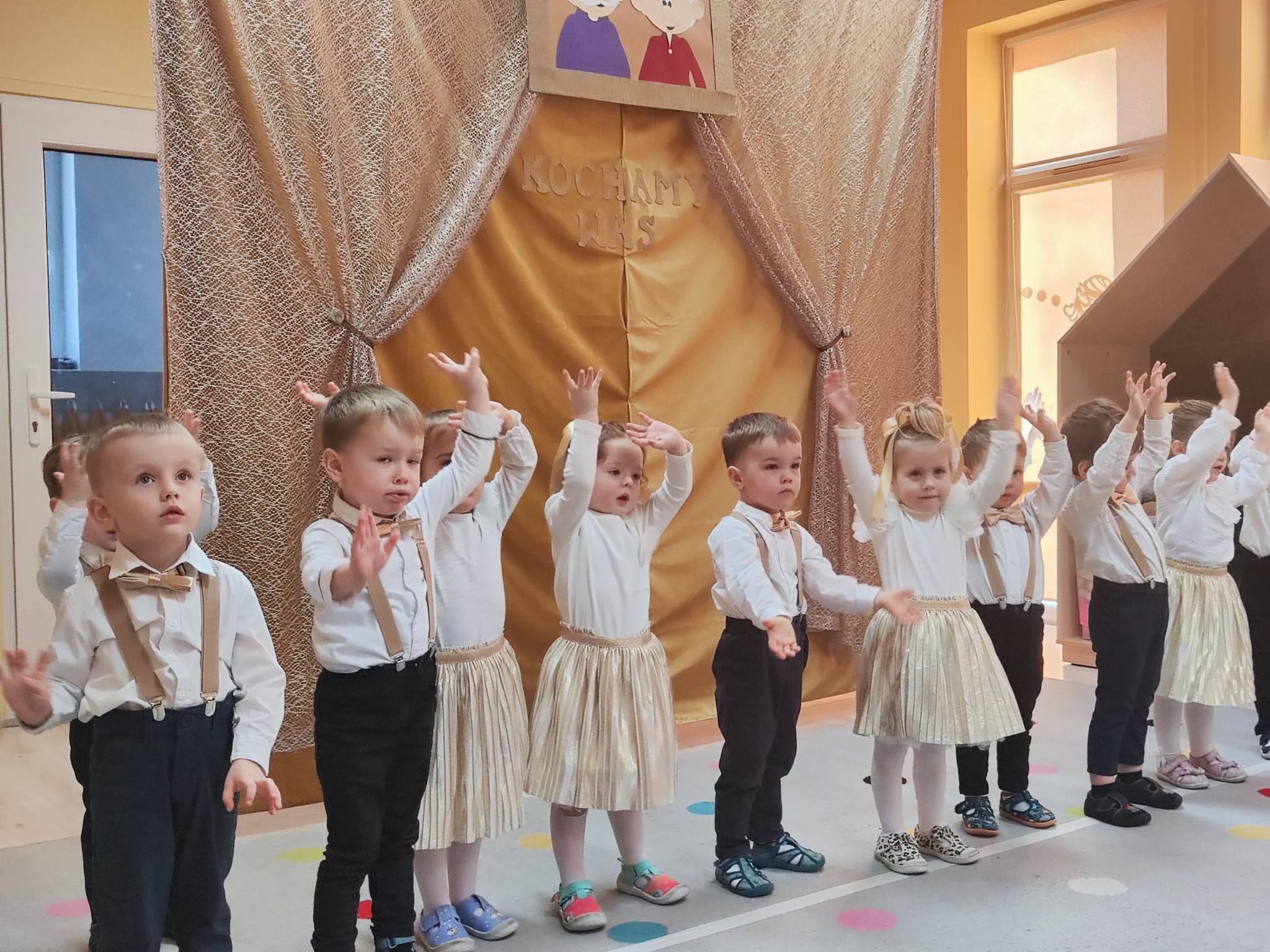 z ogromnym zaangażowaniem zaprezentowały przygotowane piosenki, wiersze i tańce, nagradzane gromkimi brawami oraz uśmiechami dumnych babć i dziadków. Atmosfera była ciepła i rodzinna.