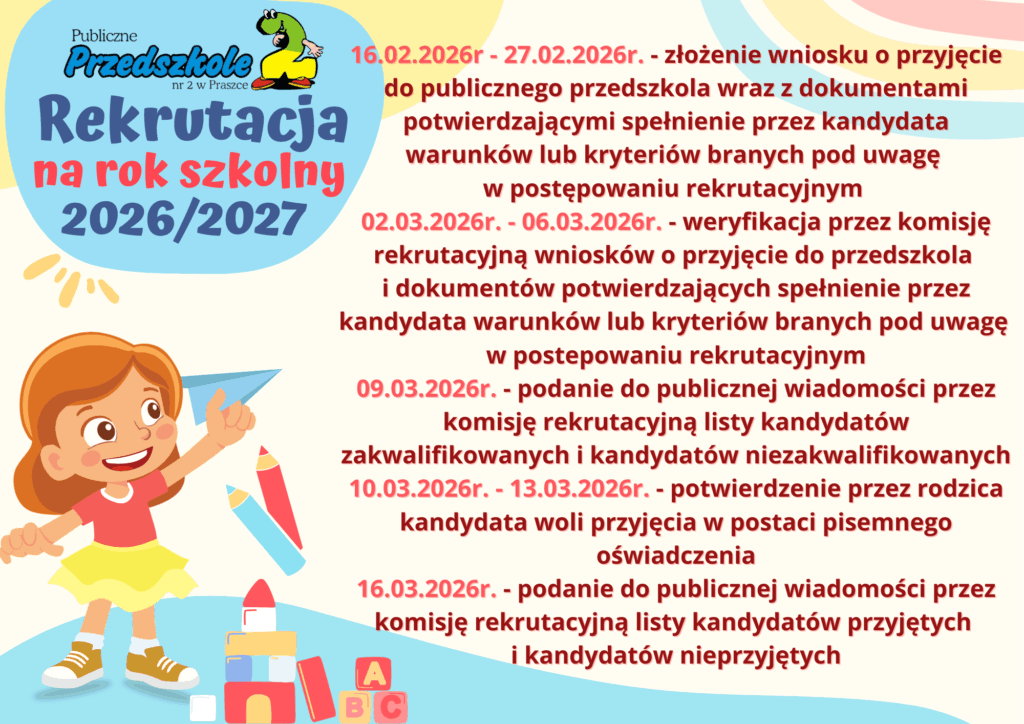 Rekrutacja 2026/2027 Dokument do pobrania:Wniosek o przyjęcie dziecka do Publicznego Przedszkola nr 2 w Praszce.Regulamin Rekrutacji 2026.Wnioski o przyjęcia dziecka do Publicznego Przedszkola nr 2 można składać od 16 lurego 2026r.