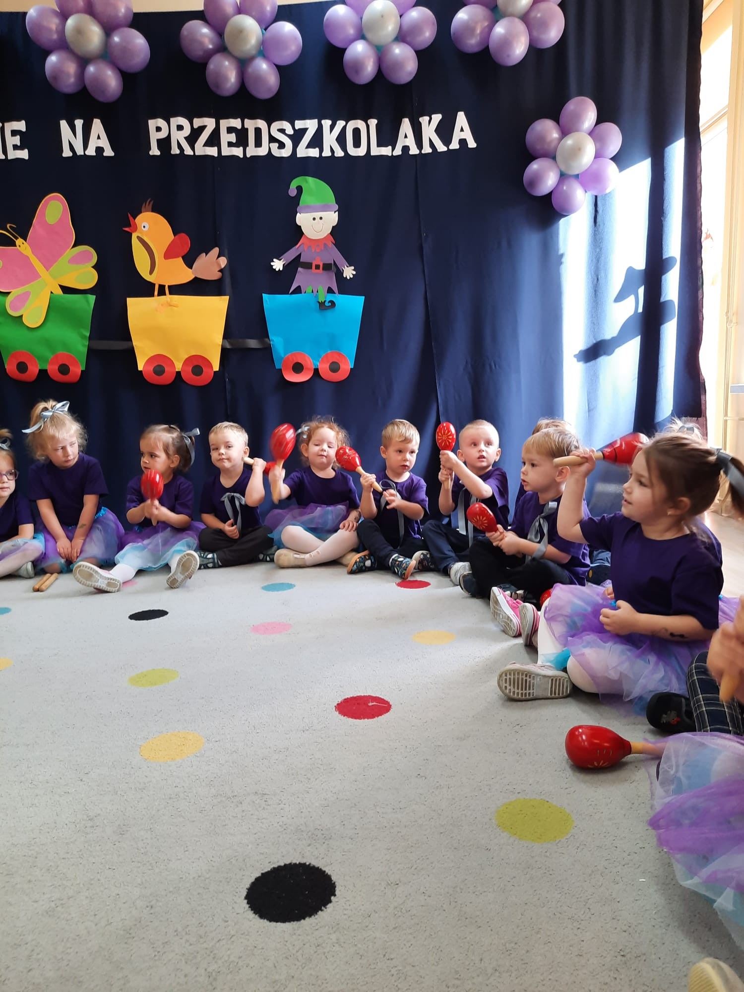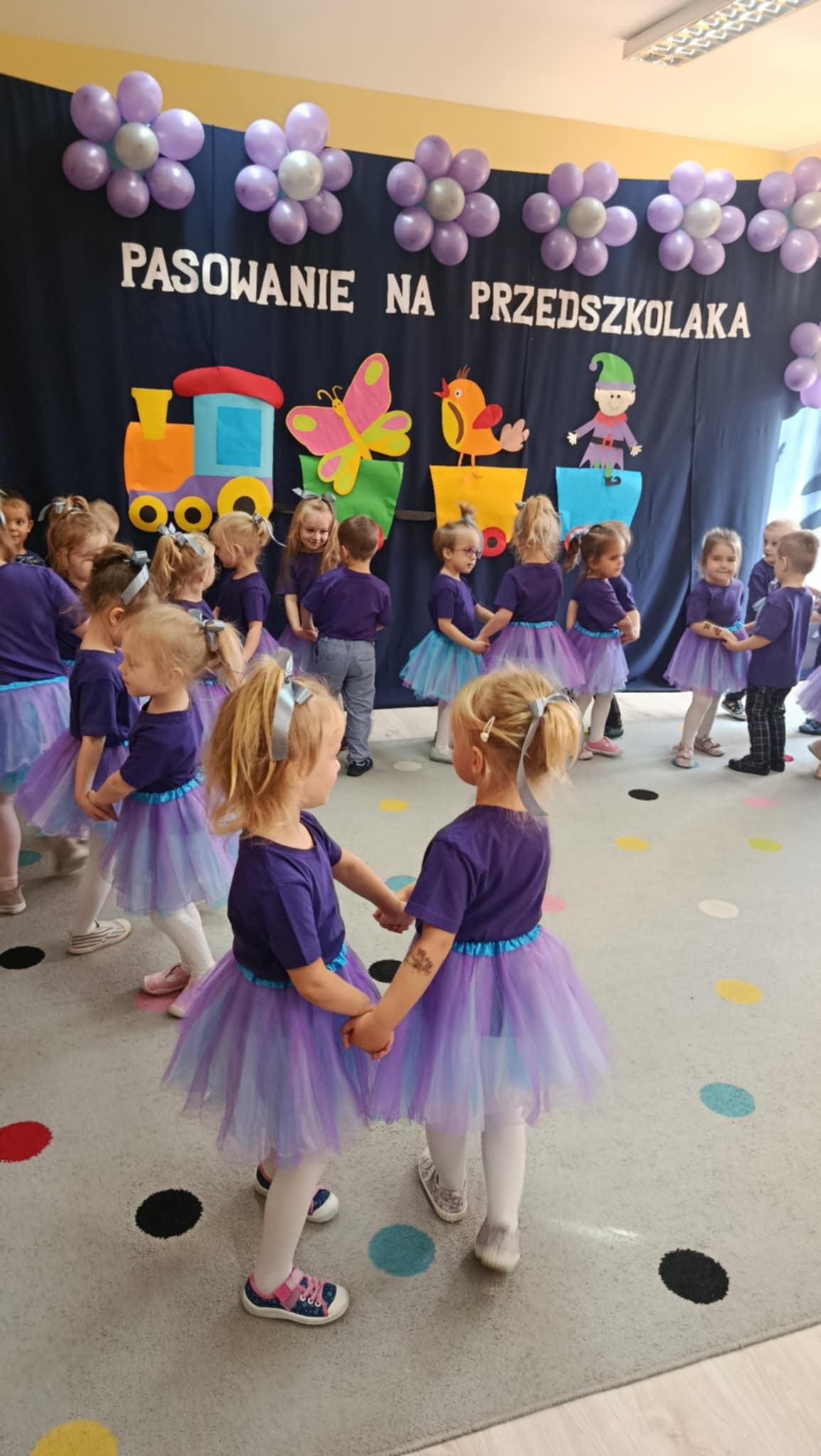 z ogromnym zaangażowaniem śpiewały piosenki, recytowały wiersze i tańczyły. Swoim występem udowodniły, że są już gotowe, by rozpocząć wspaniałą przygodę z przedszkolem. Każde dziecko zostało symbolicznie dotknięte dużą kredką – tym samym przyjęte do grona przedszkolaków. Rodzice z dumą i wzruszeniem oglądali swoje pociechy na scenie.