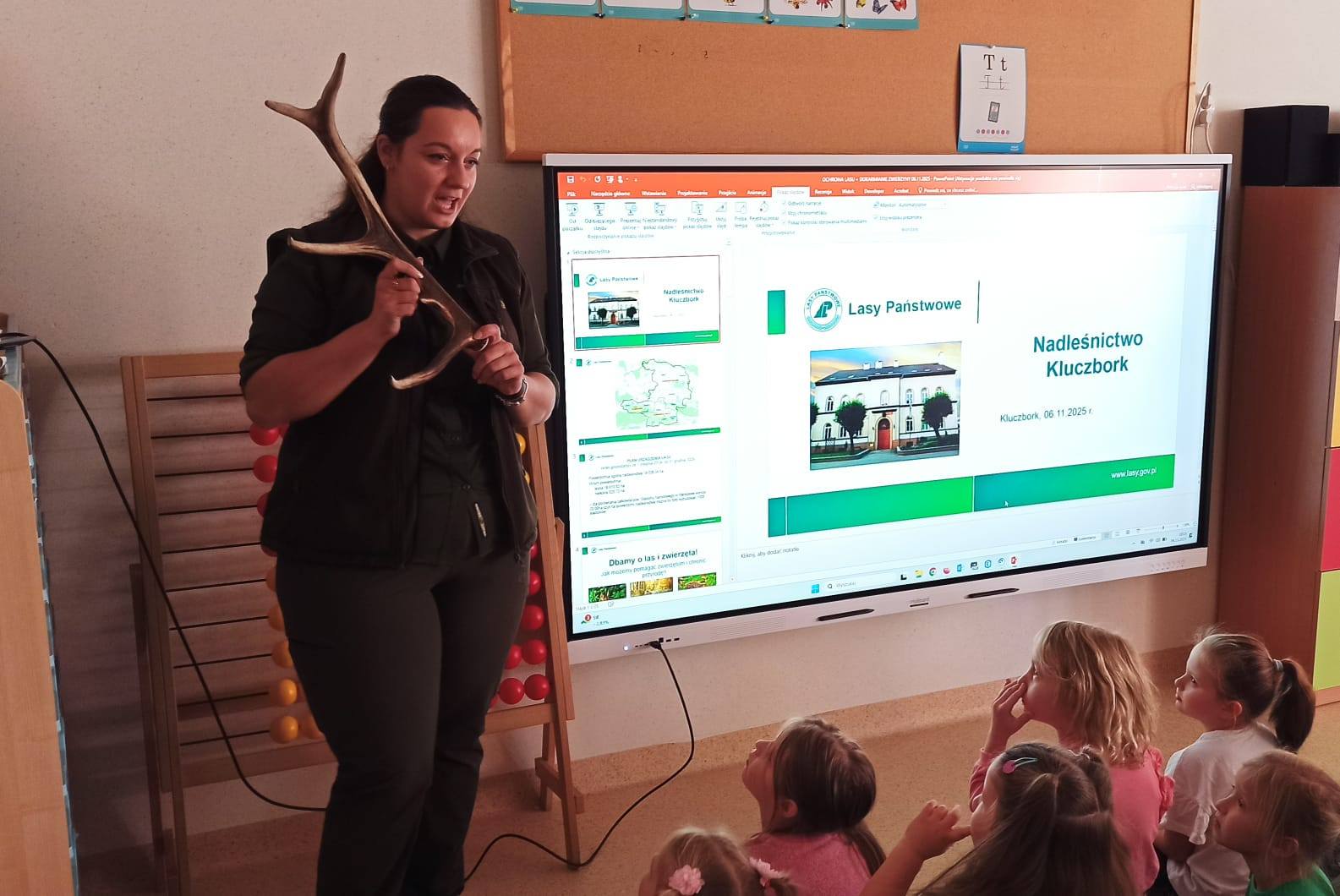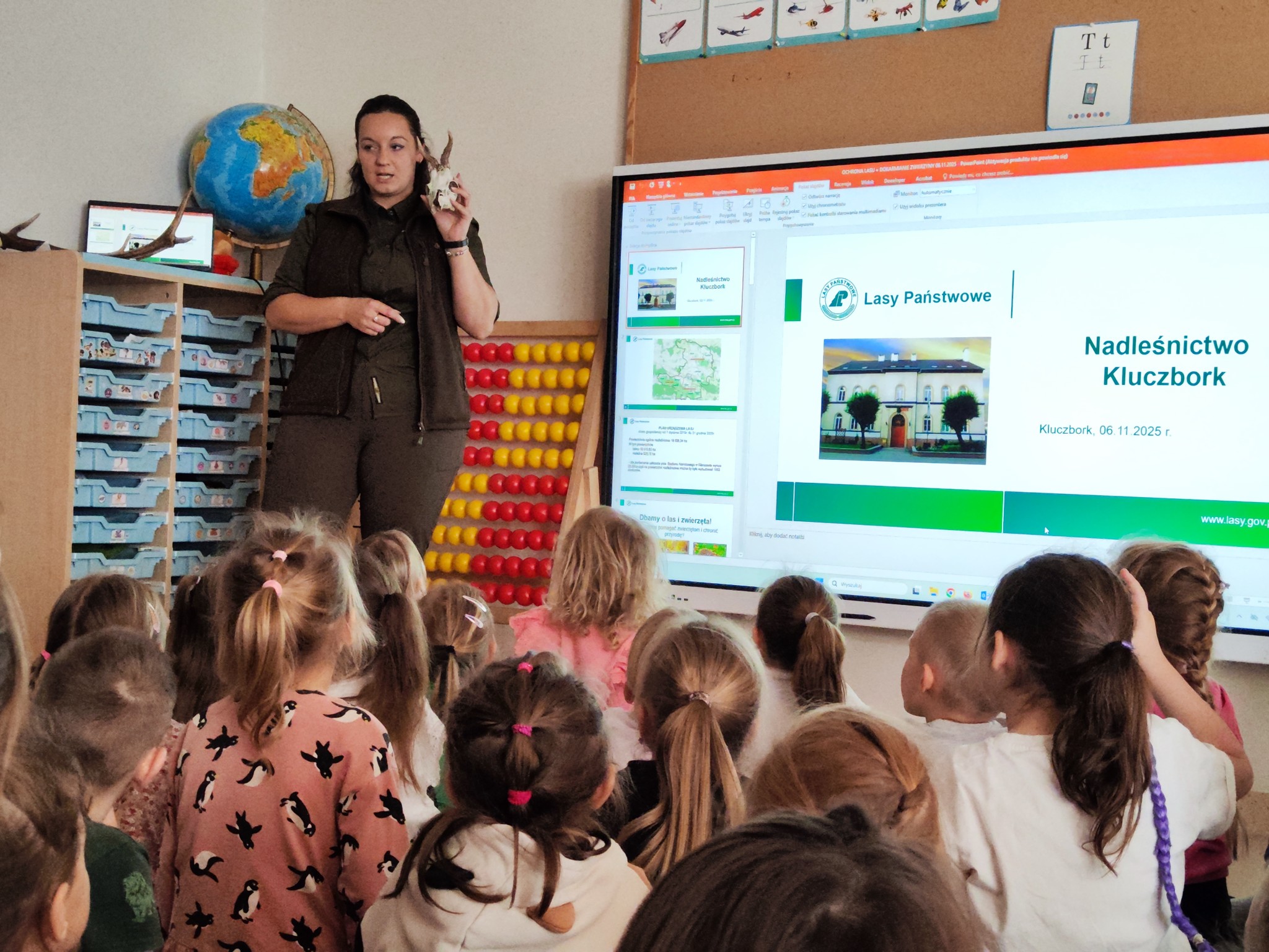 W minionym tygodniu mieliśmy okazję gościć w naszym przedszkolu pracownika Nadleśnictwa Kluczbork. Podczas spotkania dzieci miały okazję poznać pracę leśniczego, zwyczaje zwierząt zamieszkujących lasy naszej okolicy, a także ich roślinność. Dowiedzieliśmy się również w jaki sposób należy pomagać zwierzętom przetrwać zimę. Dzieci mogły pooglądać eksponaty i zdjęcia, które wzbudziły zachwyt i zaciekawienie.