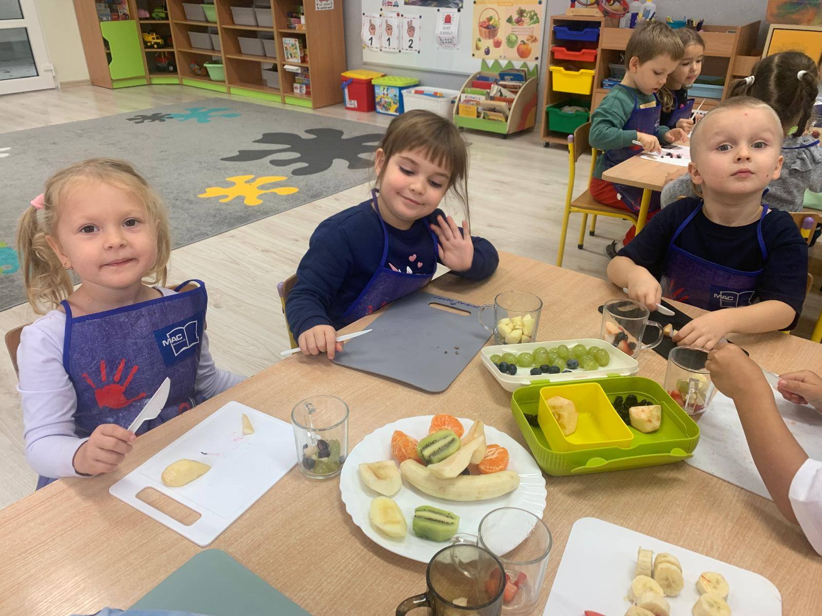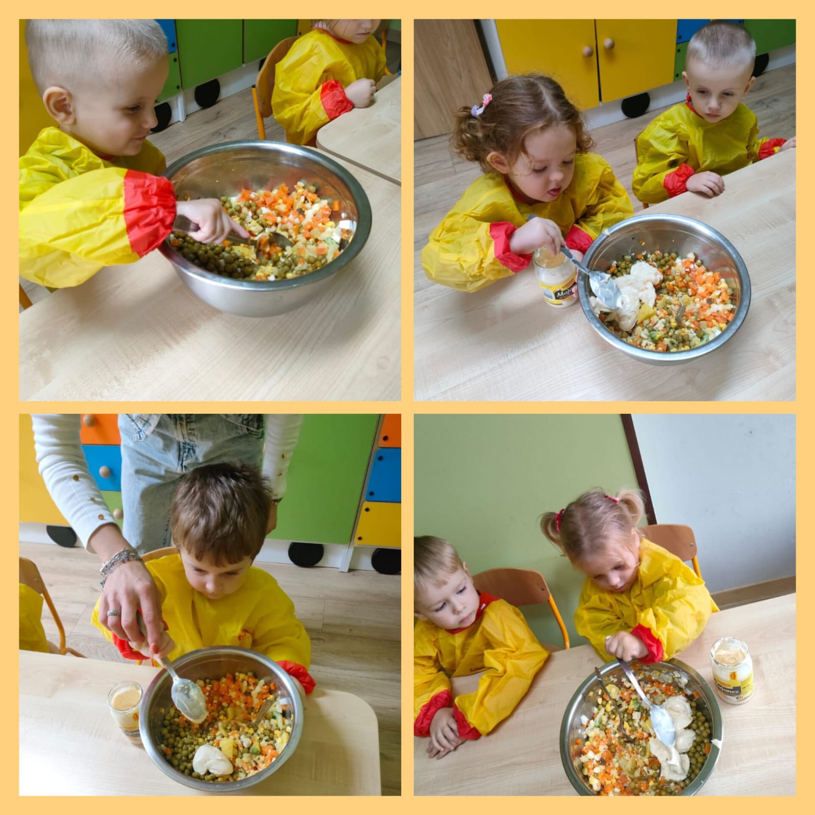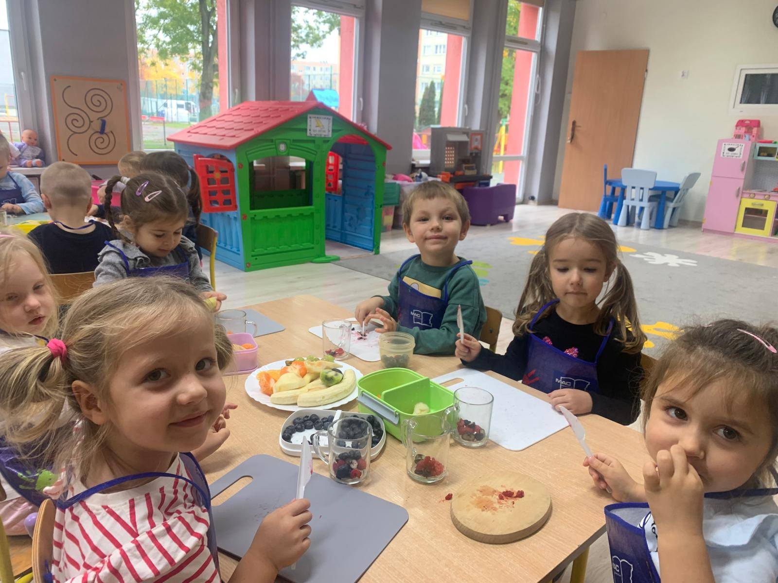 i owoców, ich nazwami, wyglądem i wartościami odżywczymi. Wybrały się również na wycieczkę do lokalnego straganu warzywno-owocowego. Na zakończenie tygodnia zrobiły pyszną, zdrową sałatkę. Dziękujemy rodzicom za przygotowanie pysznych produktów