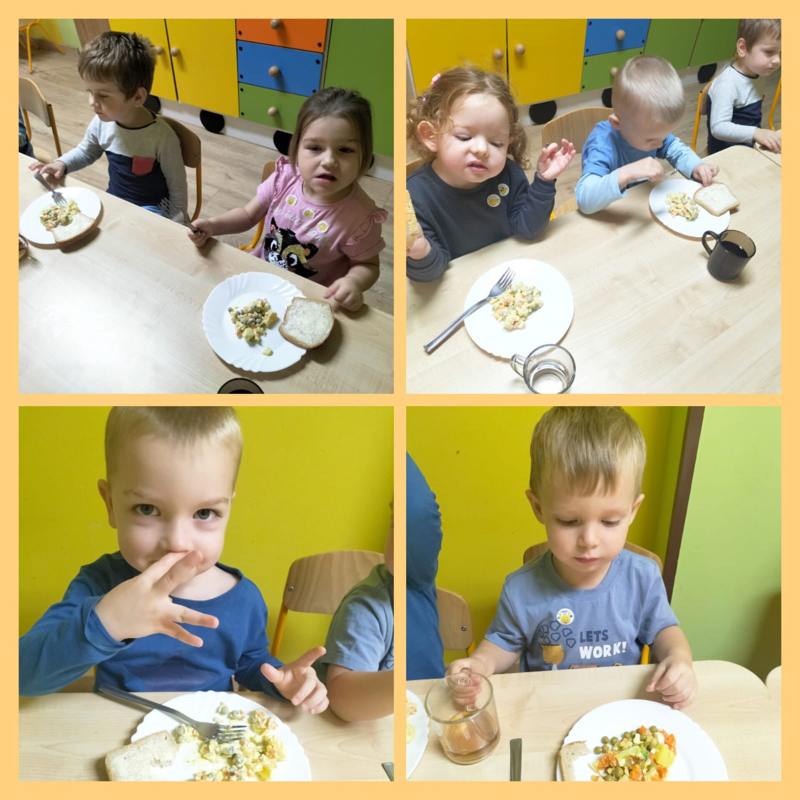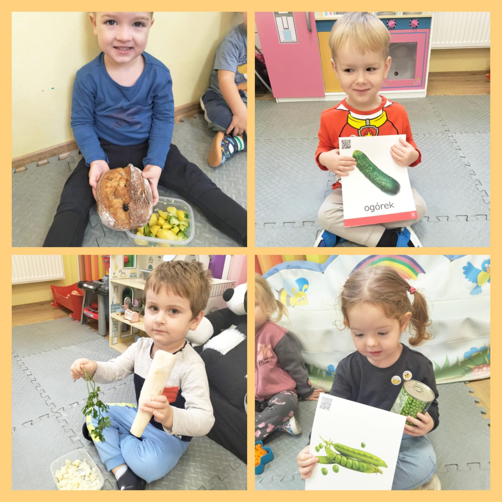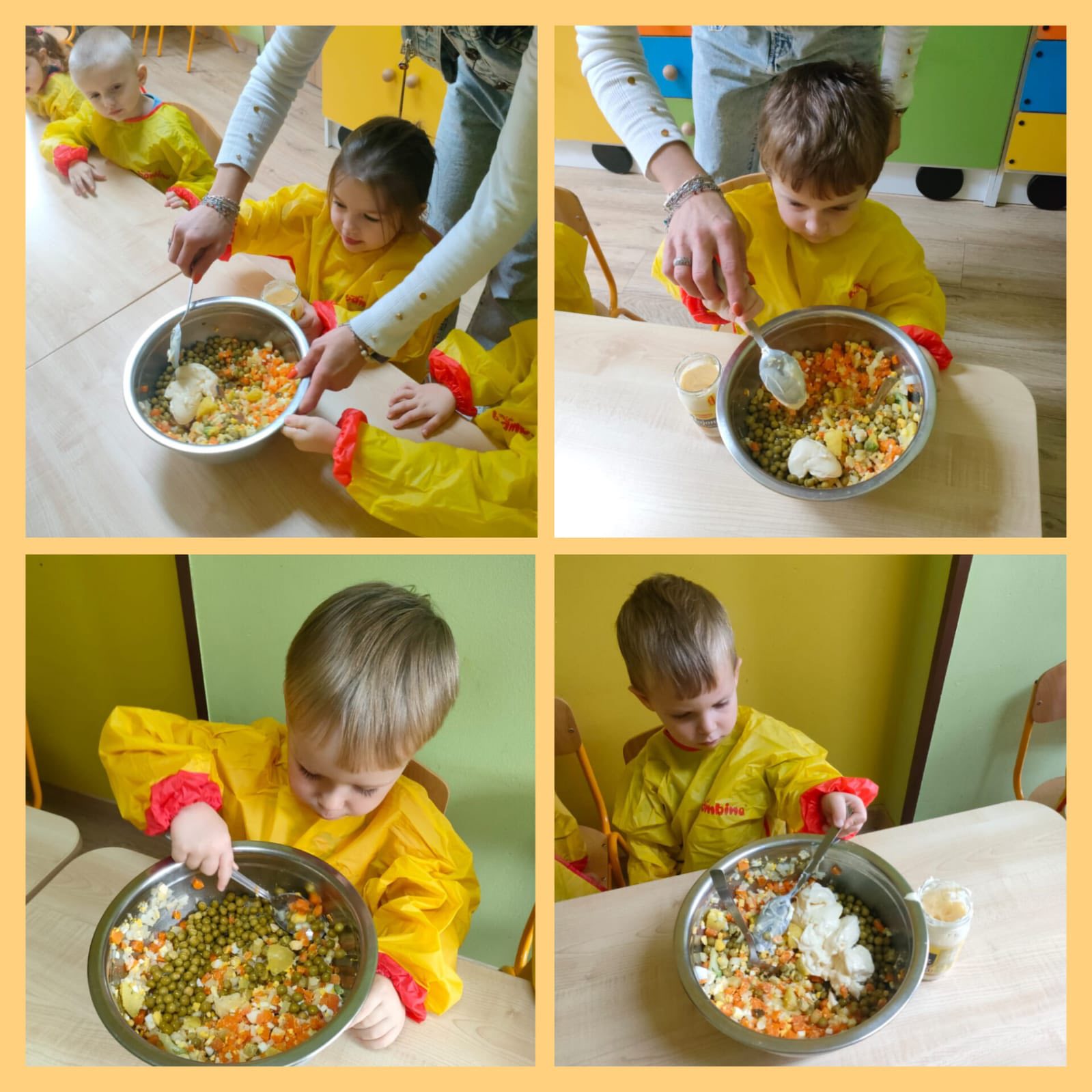 i owoców, ich nazwami, wyglądem i wartościami odżywczymi. Wybrały się również na wycieczkę do lokalnego straganu warzywno-owocowego. Na zakończenie tygodnia zrobiły pyszną, zdrową sałatkę. Dziękujemy rodzicom za przygotowanie pysznych produktów